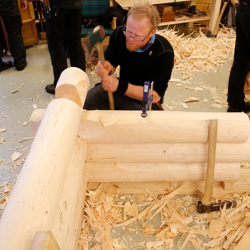 I faget har vi hatt ei vekes samling i Målselv der vi har gjennomgått eit program. Fyrste dagen starta med introduksjon til faget og ein kort historisk gjennomgang av verktøy og arbeidsmåtar. Vidare med demonstrasjon av oppmerking og hogging av sinknov med tapp i tradisjon etter Arne Pedersen. Så fekk vi demonstrert nyare type nov og merking slik Pål Prestbakk har lært på kurs. Til slutt demonstrasjon av oppmerking og hogging av knubbnov med tapp slik vi har lært i tradisjon etter Roald Haugli. Andre dagen var sett av til befaringar der vi starta med ein tur til Bardujord i Bardu der vi såg på stove, smie og fjøs frå slutten av 1700-talet før vi gjorde litt meir grundig undersøking av stabburet på garden Eggen. Etter det gjekk turen til Bardu bygdemuseum i Salangsdalen der vi såg på kornlåve og fjøs. Turen vart avslutta med eit besøk på Trondarnes kyrkje ved Harstad.