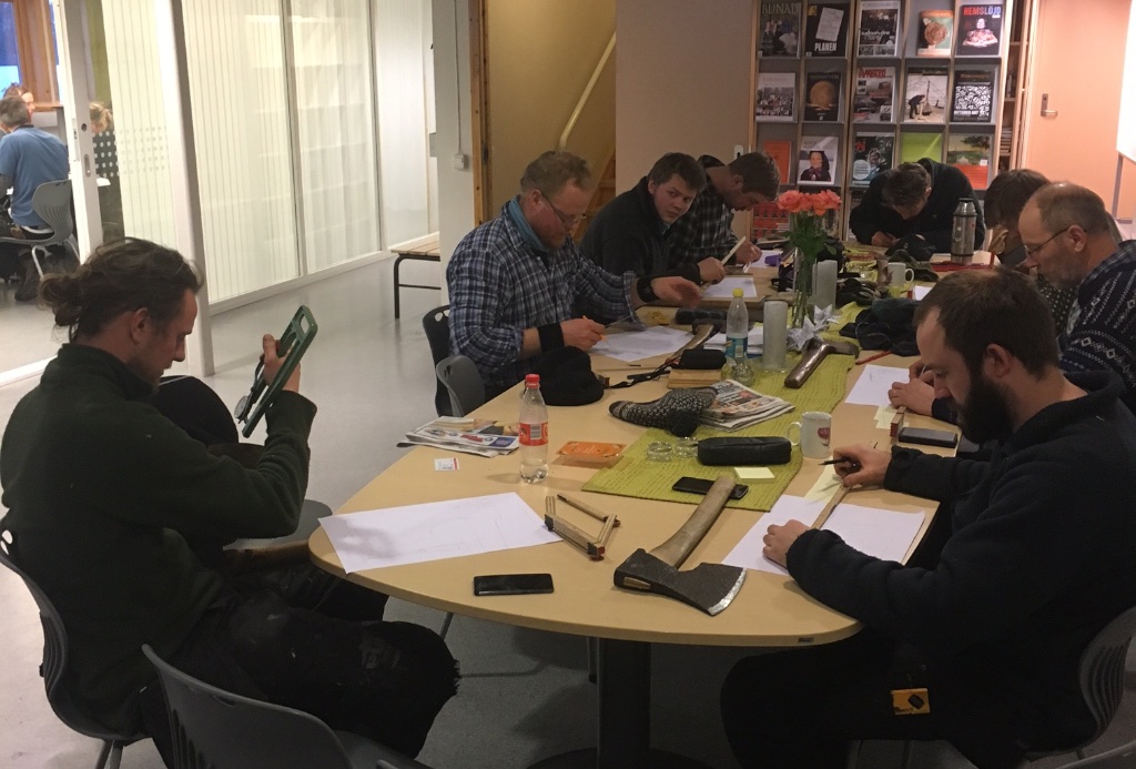 Studentane hadde også ei øvingsoppgåve der dei skulle måle opp og teikne opp kvar si øks. Dette arbeidet var med tanke på seinare kartlegging der studentane skal dokumentere lokale økser og teikne dei slik at øksesmedane kan smi etter teikningane. Foto: Roald Renmælmo