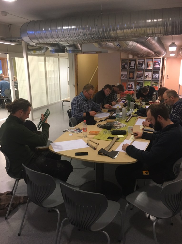 Studentane hadde også ei øvingsoppgåve der dei skulle måle opp og teikne opp kvar si øks. Dette arbeidet var med tanke på seinare kartlegging der studentane skal dokumentere lokale økser og teikne dei slik at øksesmedane kan smi etter teikningane. Foto: Roald Renmælmo