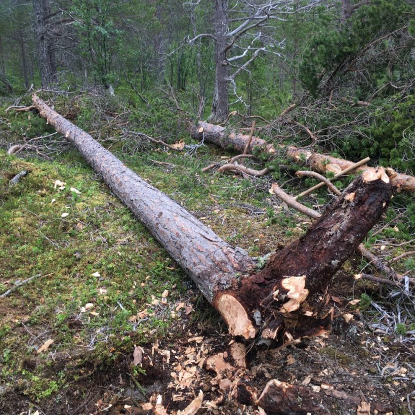 Furu med rotkne som er felt. Foto: Roald Renmælmo